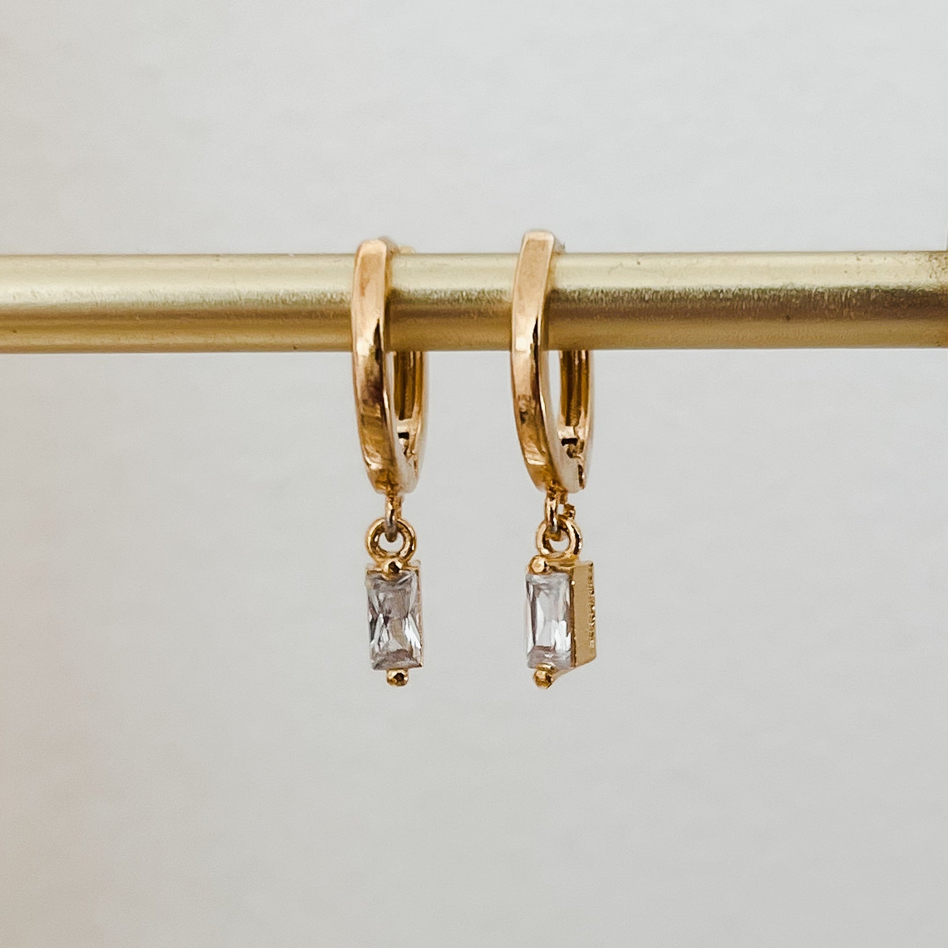 These hoops are hypoallergenic, perfect for those with sensitive ears. They are a huggie-hoop style with a cubic zirconia charm.